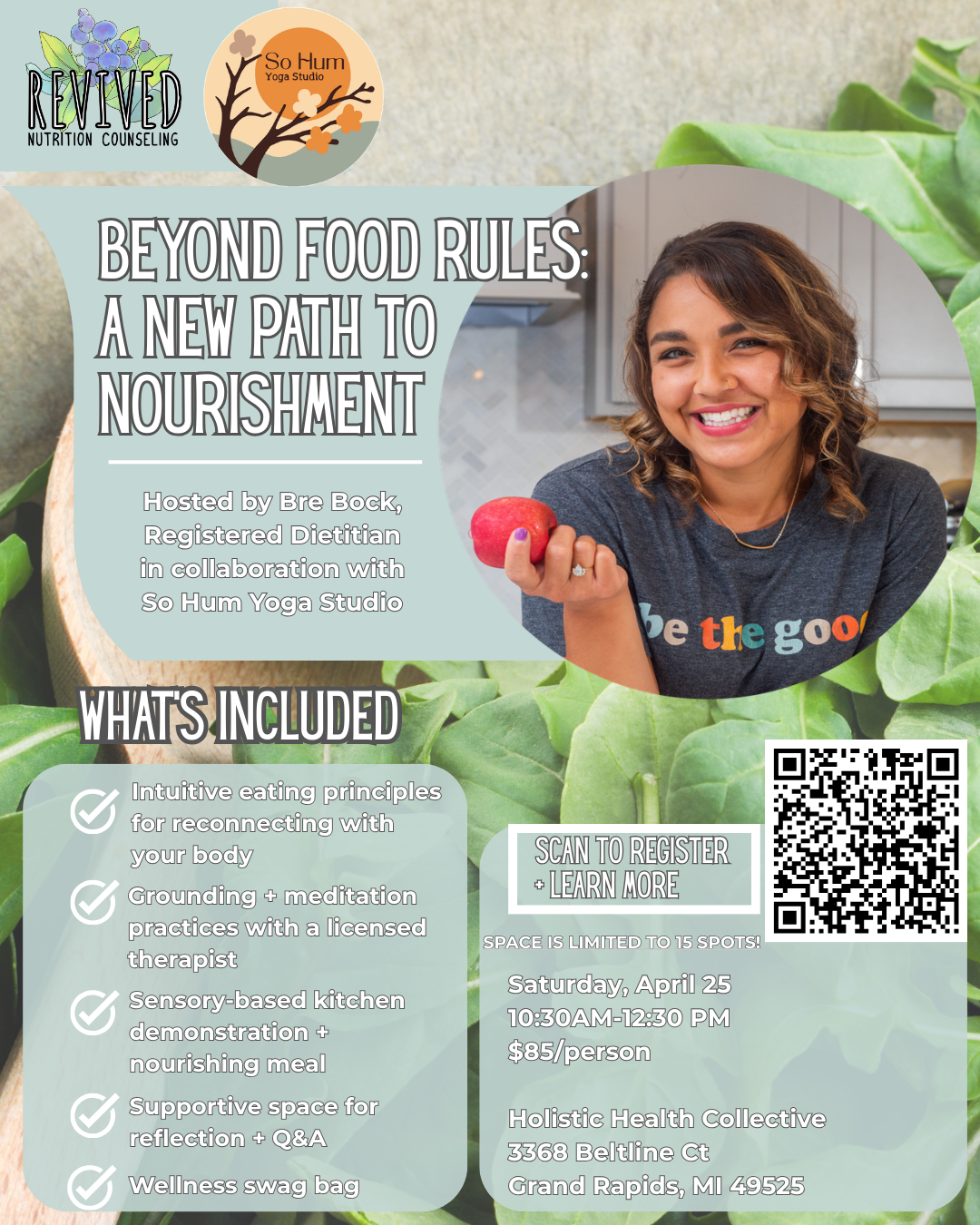 Beyond Food Rules: A New Path to Nourishment is a 2‑hour immersive workshop exploring intuitive eating, body trust, and gentle nutrition.